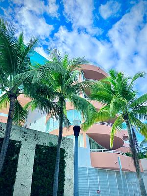 A classic pink and blue Art Deco building in Miami, with Palm Trees and a bright blue sky